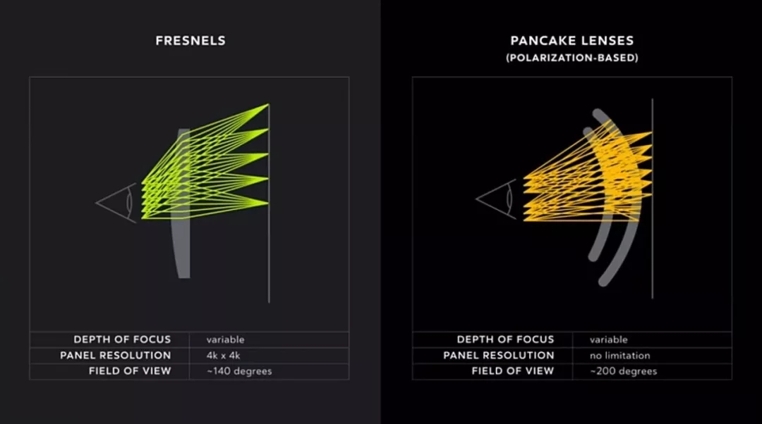 此外,2018年,Oculus首席科学家Michael Abrash也在OC5大会上展望将Pancake式超薄VR光学视为未来的光学方案,指出它在分辨率和视场角上也均有极大潜力:有望达到人眼视网膜的分辨率和大约200的视场角,而传统的菲涅尔透镜只能达到4x4k分辨率和约140度的视场角。